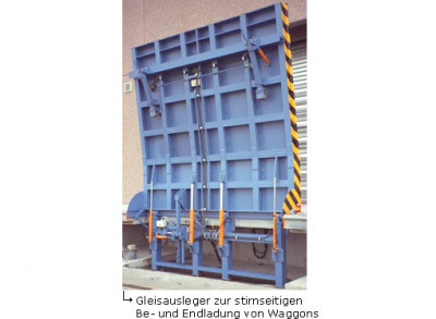 Hebebühne mit Bolzenverriegelung zu beschicken eines Autoklavs mittels Güterwaggon. |