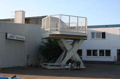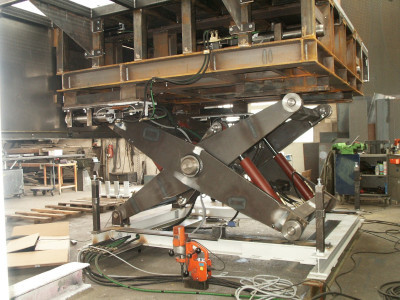 Hebebühne mit Taumelplattform mittels Königszapfen. |
