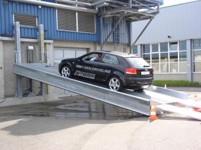 Fahrversuchsrampe mit automatischer Höhenverstellung um 5° zum Traktions-Tests bei unterschiedlichen Oberflächen. |